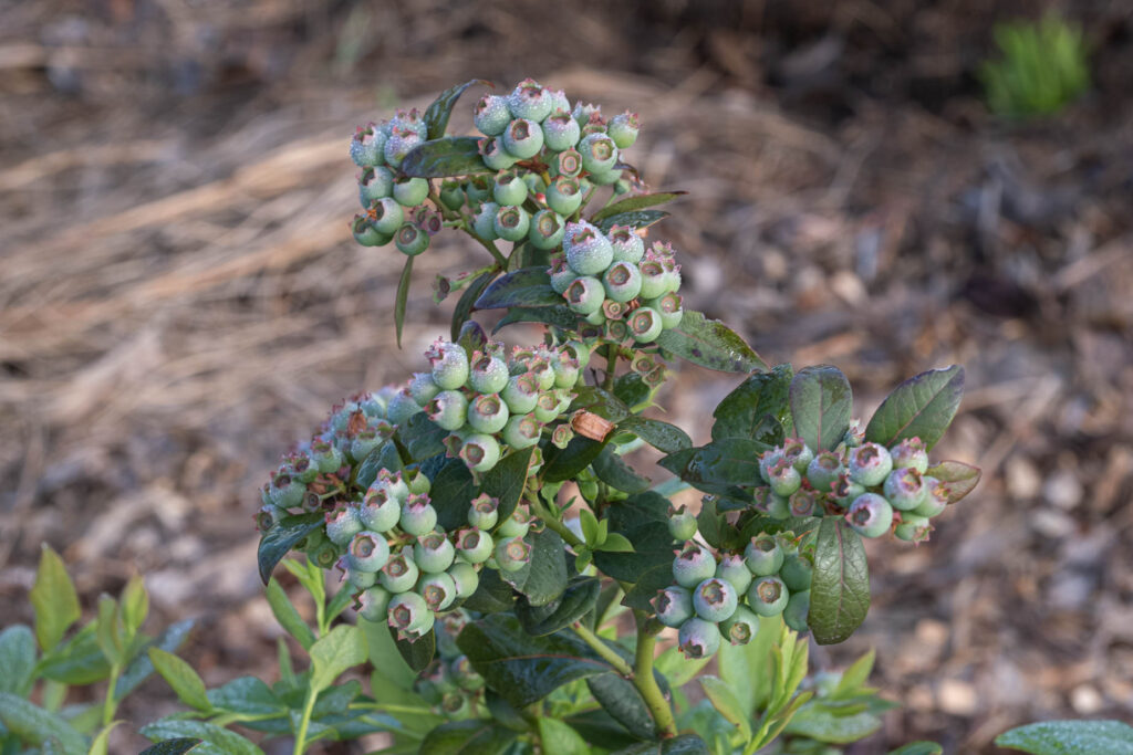 Vi upptäckte efter någon vecka efter våra första skördade blåbär att både koltrastar och blåskator gillar blåbären i år, förra året lät de dem vara. Så jag satte bärnät på fyra av våra fem stora buskar. Har två små också som inte bar någon frukt i år. Nu äter ju fåglarna genom bärnätet om det ligger direkt på buskarna, så till nästa år så får vi hitta på en bättre lösning för att få alla bär själva. Det tar ungefär en månad att få mogna bär från det att blommorna förvandlats till små gröna bär. En lång väntan, men så värd det!