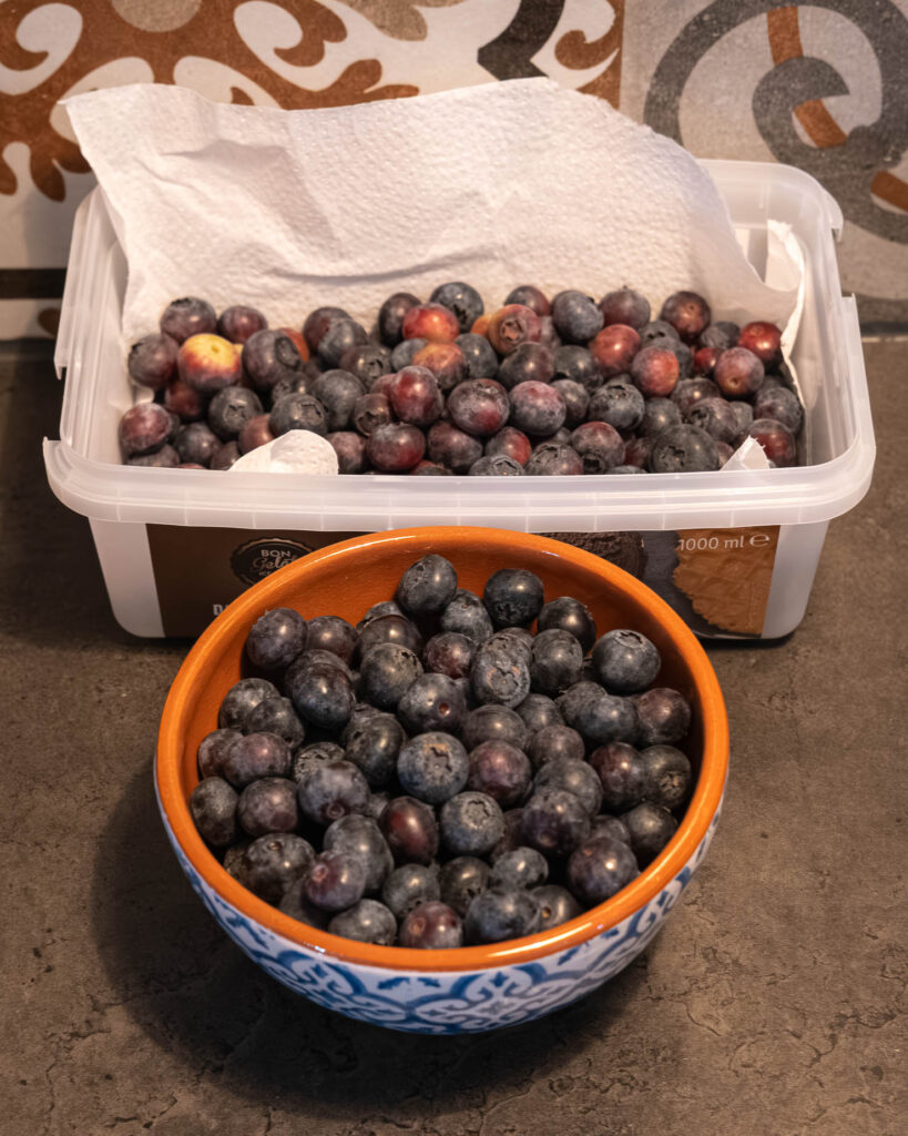 Det är verkligen underbart gott med egna blåbär och så glad för det som jag nu har i frysen trots frossandet av färska. En fuktig handduk är skönt även för oss 2-benta absolut, men än har vi inte behövt det – vi har takfläktar som är riktigt effektiva.