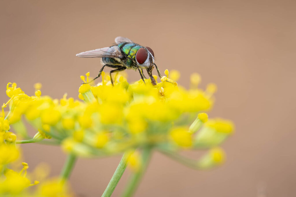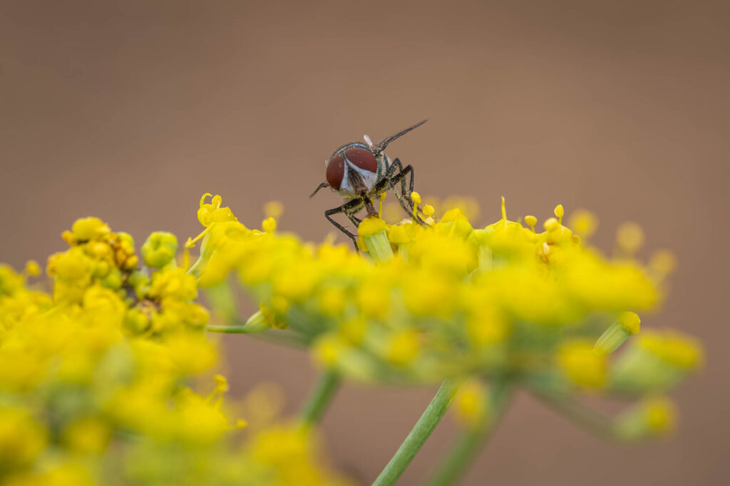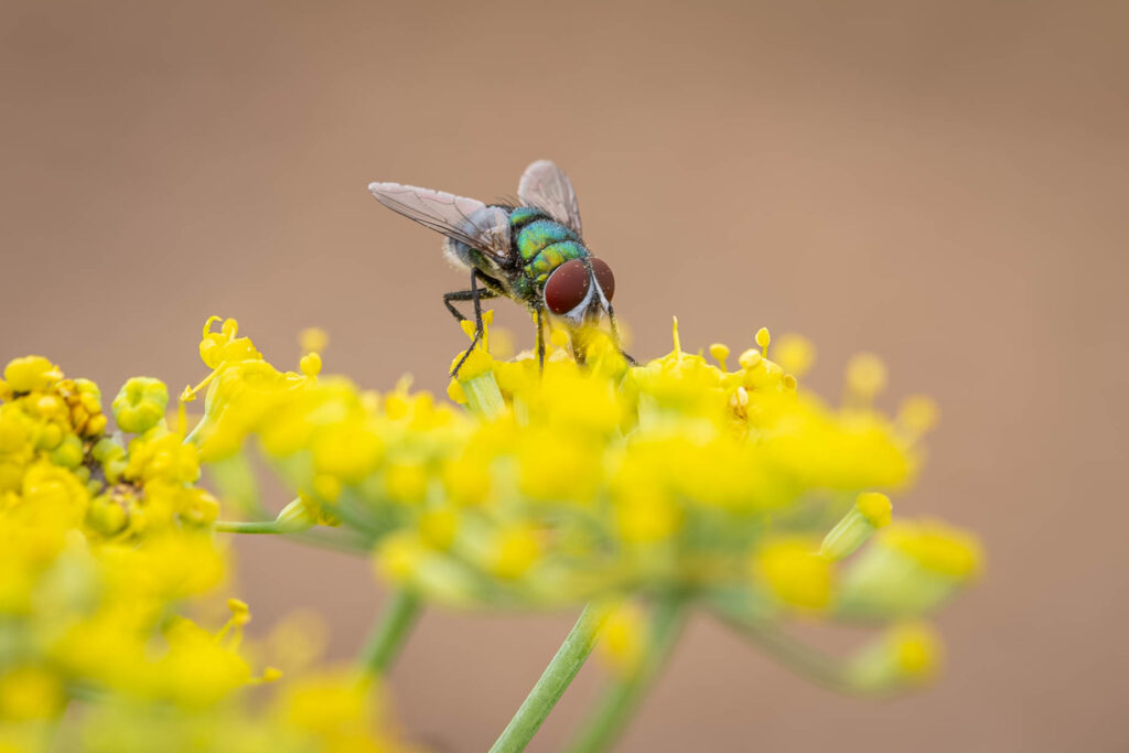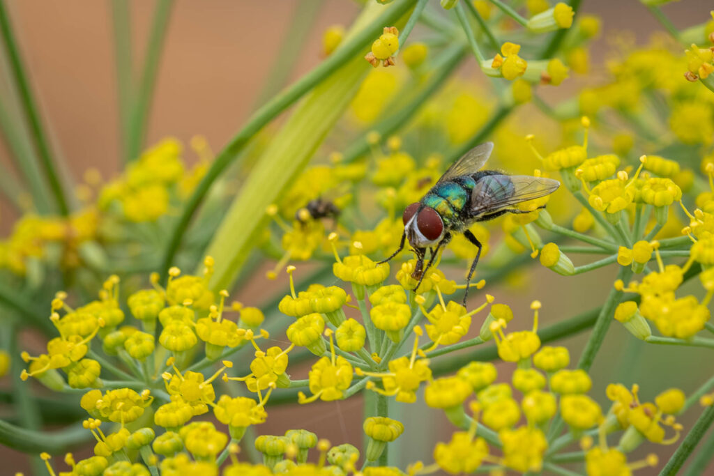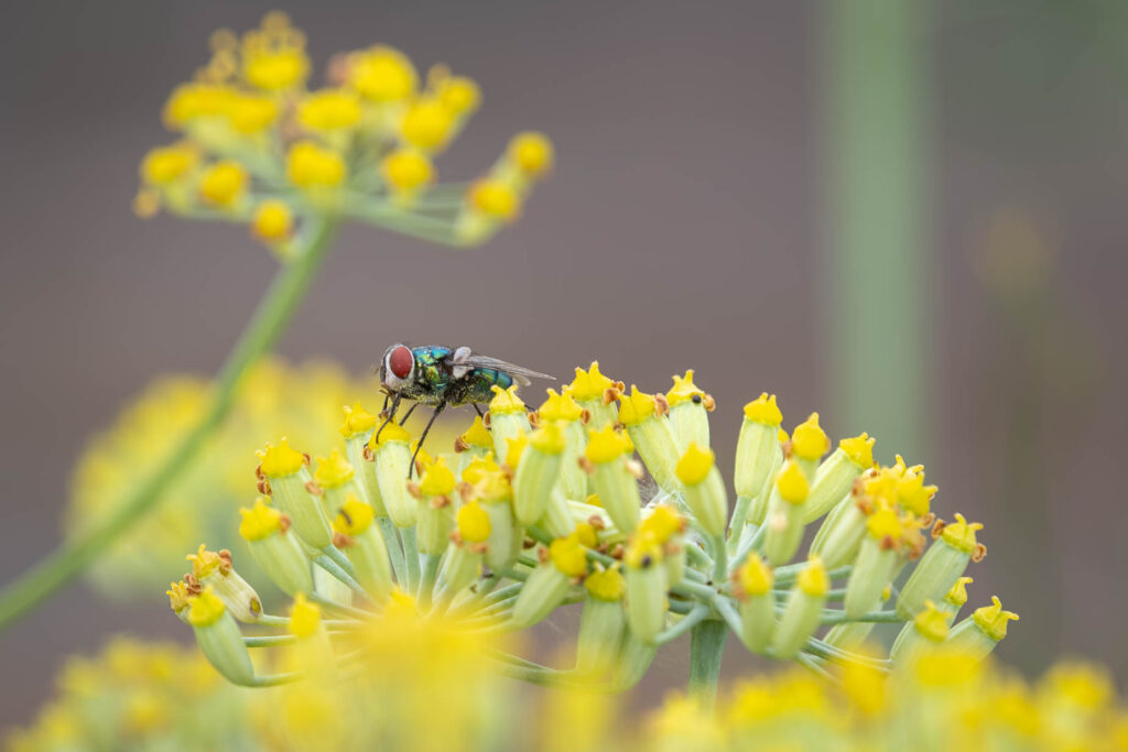 Flugor är normalt inte kul, de är otroligt irriterande faktiskt. Men den här tyckte jag om att fotografera. Så fin färg och i den blommande fänkålen hittade den tydligen mycket gott. En spyfluga av något slag gissar jag.